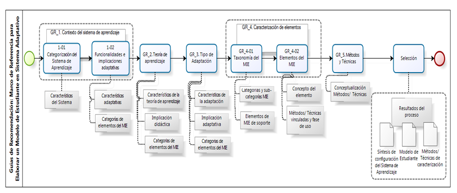 La siguiente figura muestra el mapa del proceso que en la parte superior da a conocer las guías de recomendación como actividades, mientras que en la parte inferior relaciona los productos resultantes de cada actividad.
